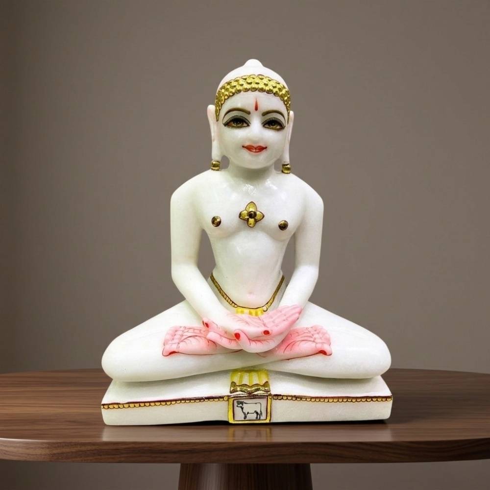 यह खूबसूरत आदिनाथ भगवान की मूर्ति मार्बल से बनी है और 11 इंच की ऊंचाई के साथ बहुत आकर्षक है। मूर्ति का चमकदार सफेद रंग इसकी पवित्रता को दर्शाता है, और शरीर पर सुनहरे और रंग-बिरंगे अलंकरण इसकी शोभा बढ़ाते हैं। भगवान आदिनाथ ध्यान मुद्रा में विराजमान हैं, जो शांति और आध्यात्मिकता का प्रतीक है। सुनहरा मुकुट, छोटे-छोटे रंगीन चिह्न, और आधार पर सुनहरे किनारे इसे और भी दिव्य बनाते हैं।