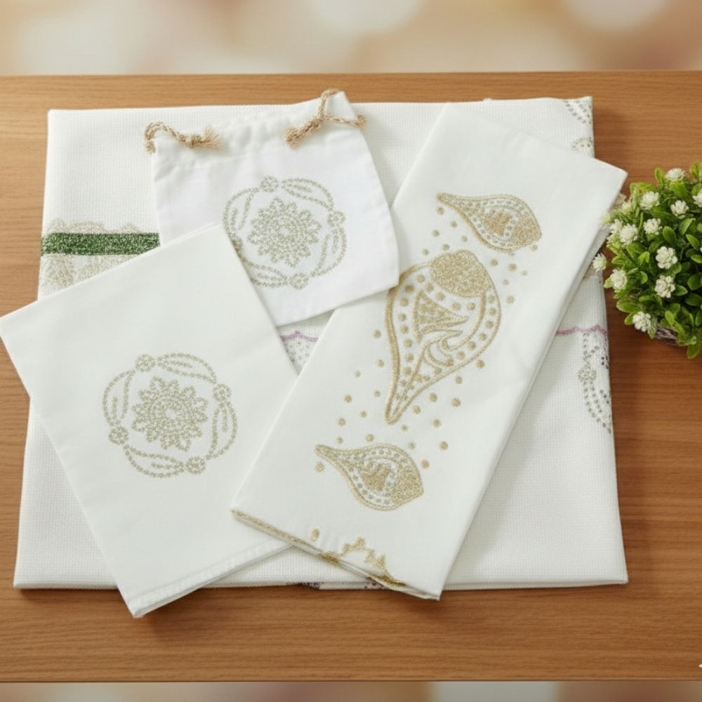 - Design: Features elegant golden prints on a pristine white background, adding a touch of sophistication and tradition. The Mukosh showcases a beautiful Shankh (conch shell) design.