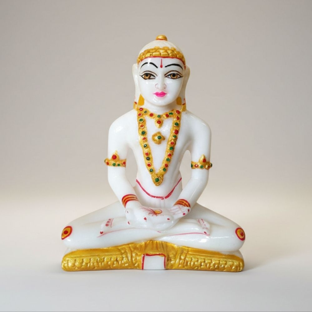 यह सुंदर महावीर स्वामी की मूर्ति मार्बल पाउडर से बनी है और 7 इंच की ऊंचाई के साथ बहुत आकर्षक है। मूर्ति का चमकदार सफेद रंग इसकी पवित्रता को दर्शाता है, और शरीर पर सुनहरे और रंग-बिरंगे अलंकरण इसकी शोभा बढ़ाते हैं। भगवान महावीर स्वामी ध्यान मुद्रा में विराजमान हैं, जो शांति और आध्यात्मिकता का प्रतीक है। सुनहरा मुकुट, रंगीन माला, और छोटे-छोटे चिह्न इसे और भी खूबसूरत बनाते हैं।