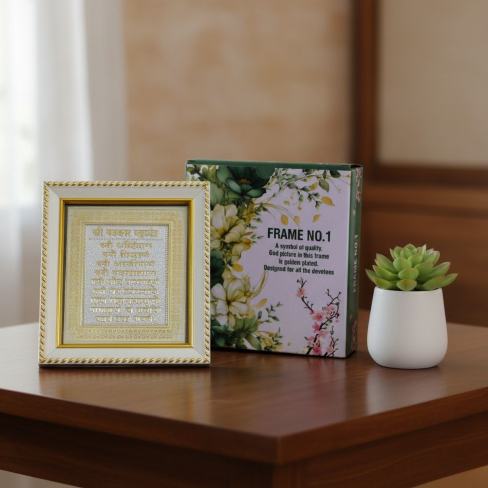 यह सुंदर नवकार मंत्र फ्रेम 5 x 6 इंच का है, जो सोने की प्लेटिंग से चमकदार लगता है। सफेद फ्रेम में नवकार मंत्र की साफ-साफ लिखाई घर में शांति लाती है। यह फ्रेम मंदिर या पूजा घर में रखने के लिए बहुत अच्छा है। जैन धर्म में नवकार मंत्र अहिंसा और सकारात्मकता सिखाता है। यह प्रतिष्ठा, प्रभावना या दीक्षा जैसे पवित्र मौकों पर उपहार देने के लिए बढ़िया है। अपने प्यार करने वालों को यह देकर आप उन्हें आशीर्वाद दे सकते हैं। इसे अपनी पसंद से बदलें और इसे और खास बनाएं!